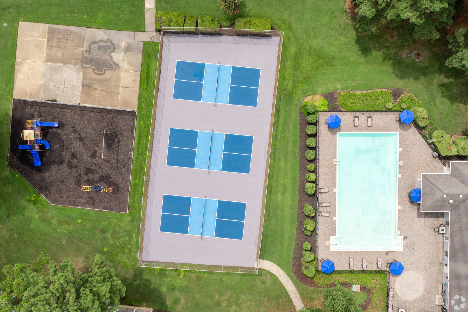Aerial view of our playground, pickleball courts, and swimming pool